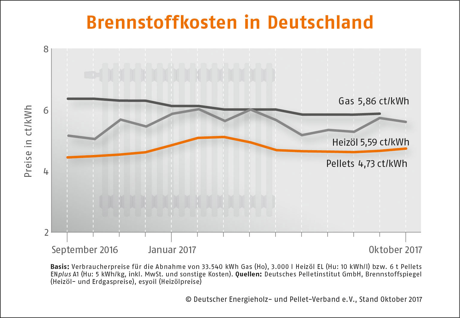 Ein Kilogramm Holzpellets ist für 25,13 Cent erhältlich, eine Kilowattstunde (kWh) Wärme aus Pellets für 5,03 Cent. Im Vergleich zu Heizöl bedeutet das einen Preisvorteil für Holzpellets von rd. 30 Prozent.